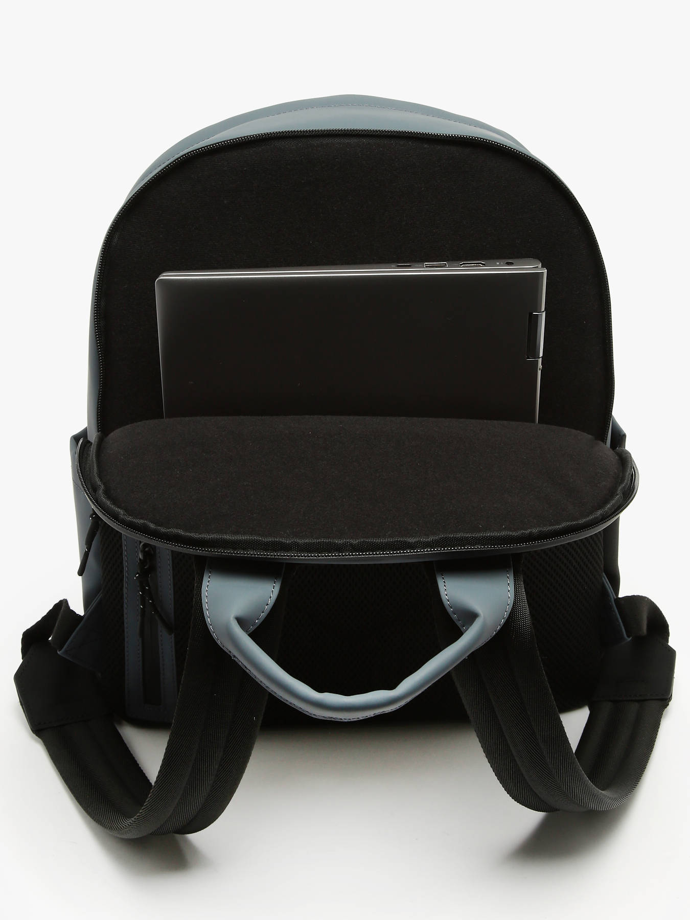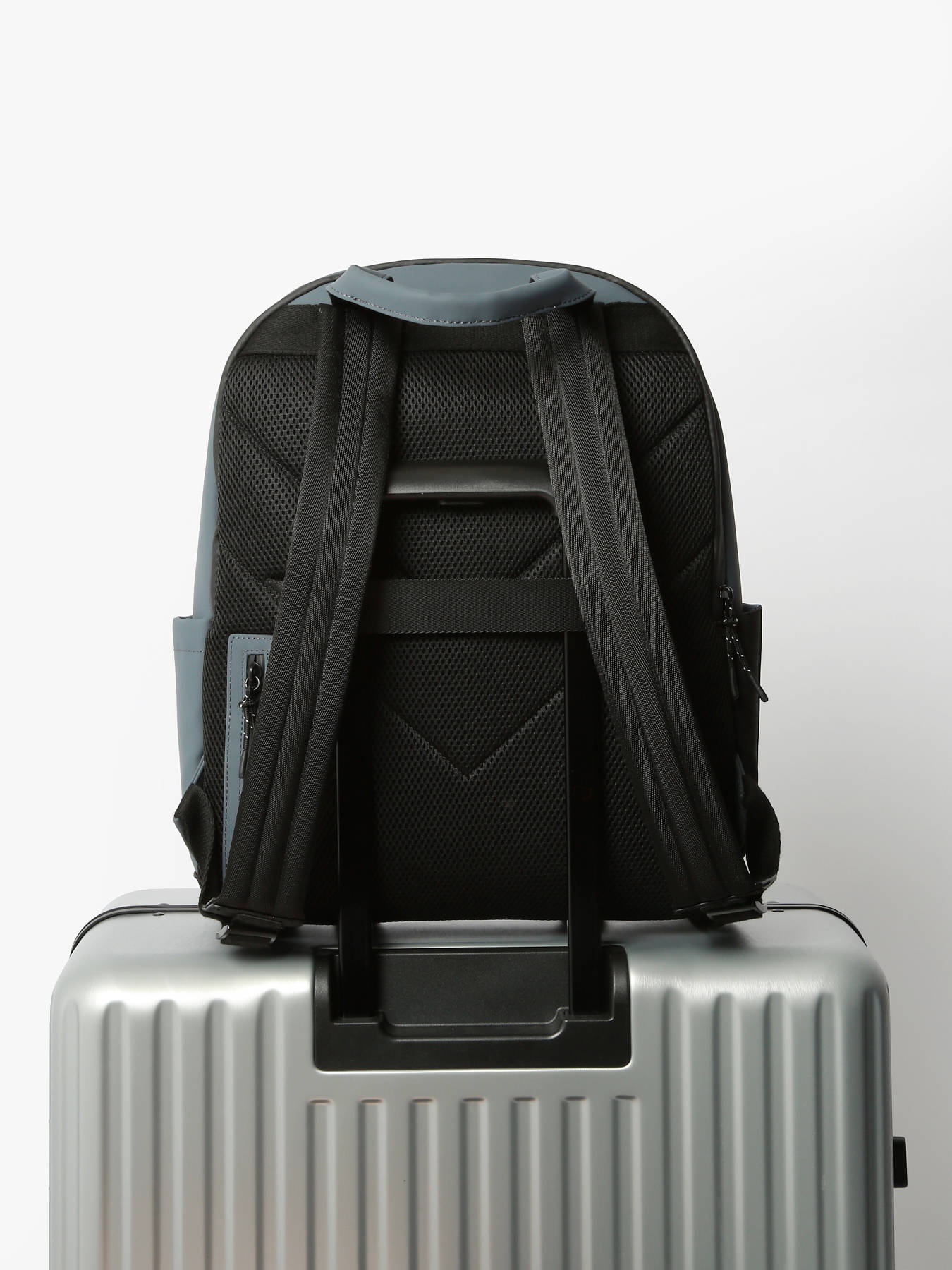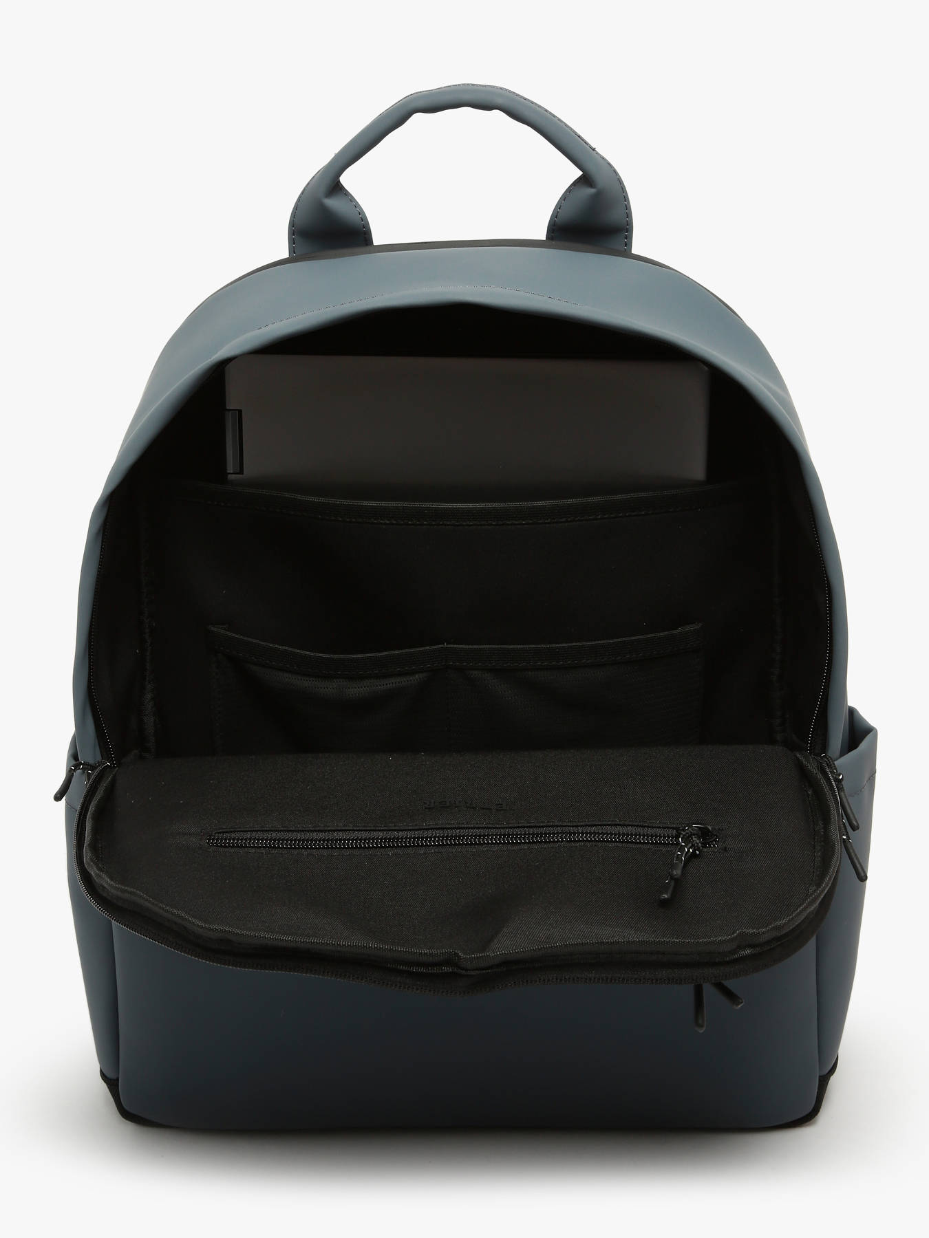 This business backpack from the Impulsion line, made of waterproof polyurethane, combines elegance and practicality. It features an embossed tone-on-tone logo and a telescopic handle pass-through. It includes two front pockets, one back pocket, and inside, it is divided into two compartments with three simple pockets, one quick-access pocket, and a reinforced compartment for a 15"" laptop.