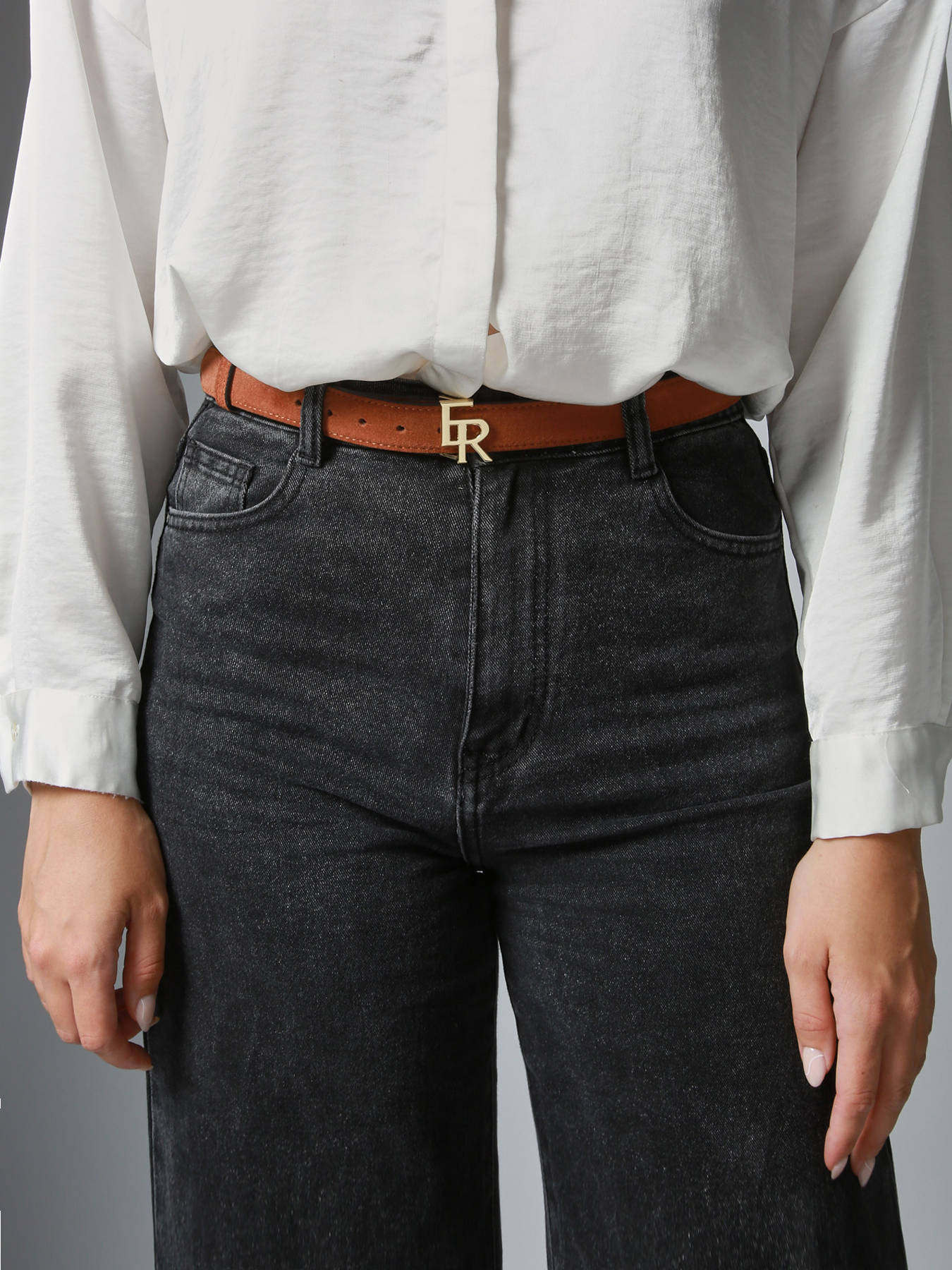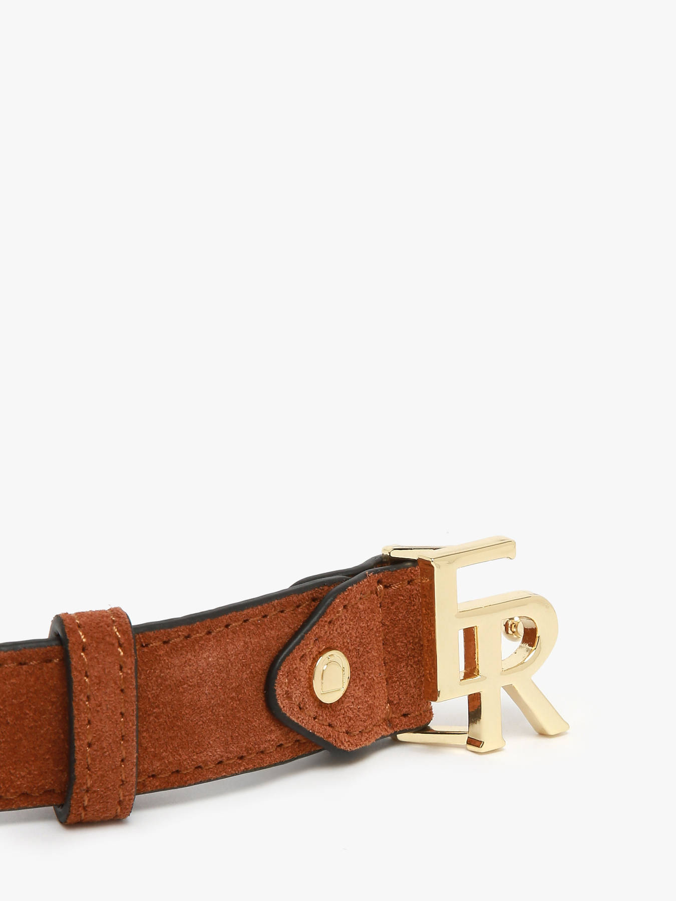 The belt from the BRUMBY line by ETRIER, crafted in suede leather, brings an elegant and natural touch to your outfits. Adjustable from 100 to 110 cm, it easily fits your silhouette. Its refined buckle, adorned with the signature ""ETR"" charm, subtly highlights the brand’s identity with style. A chic and timeless accessory to wear every day.