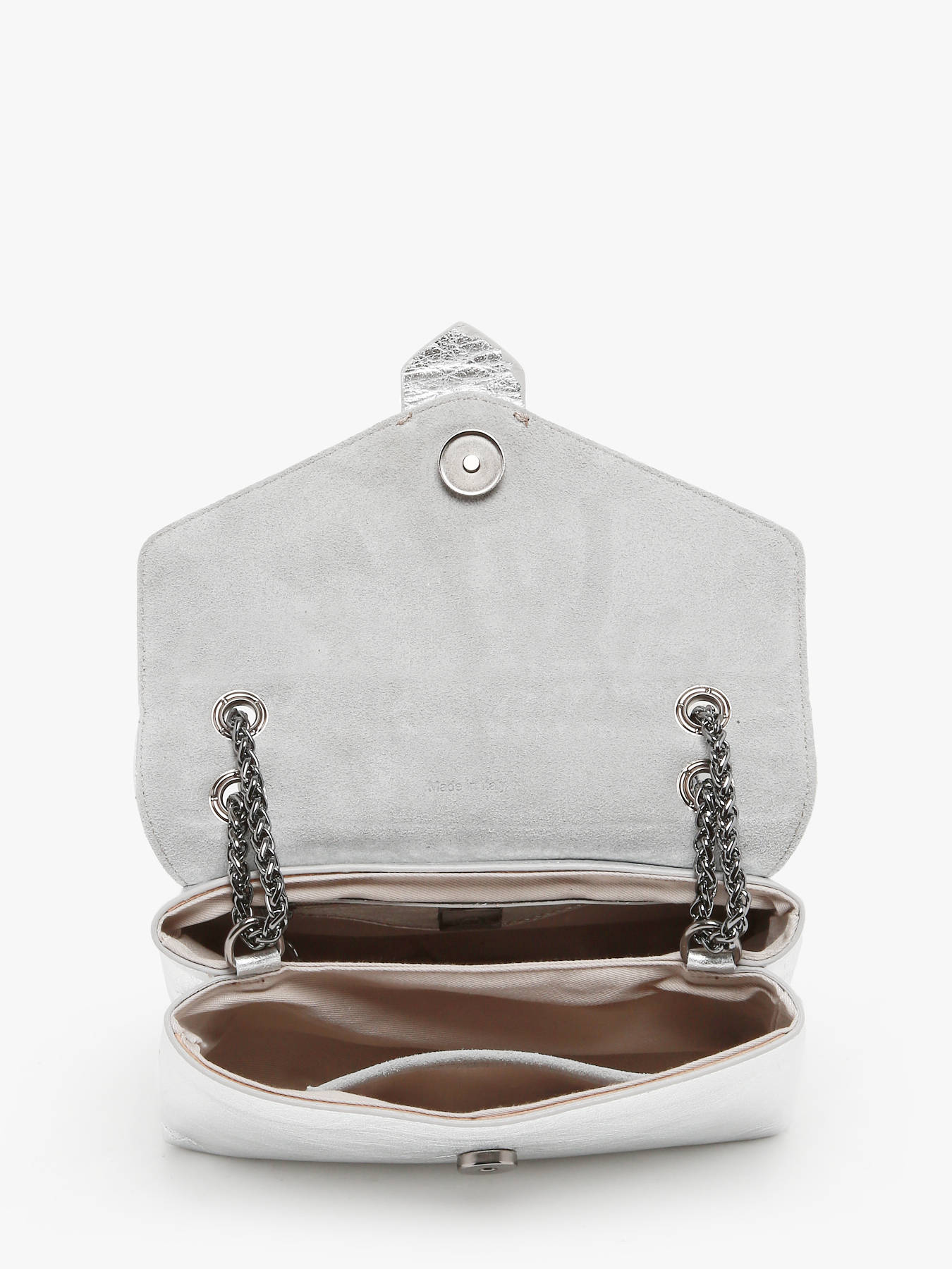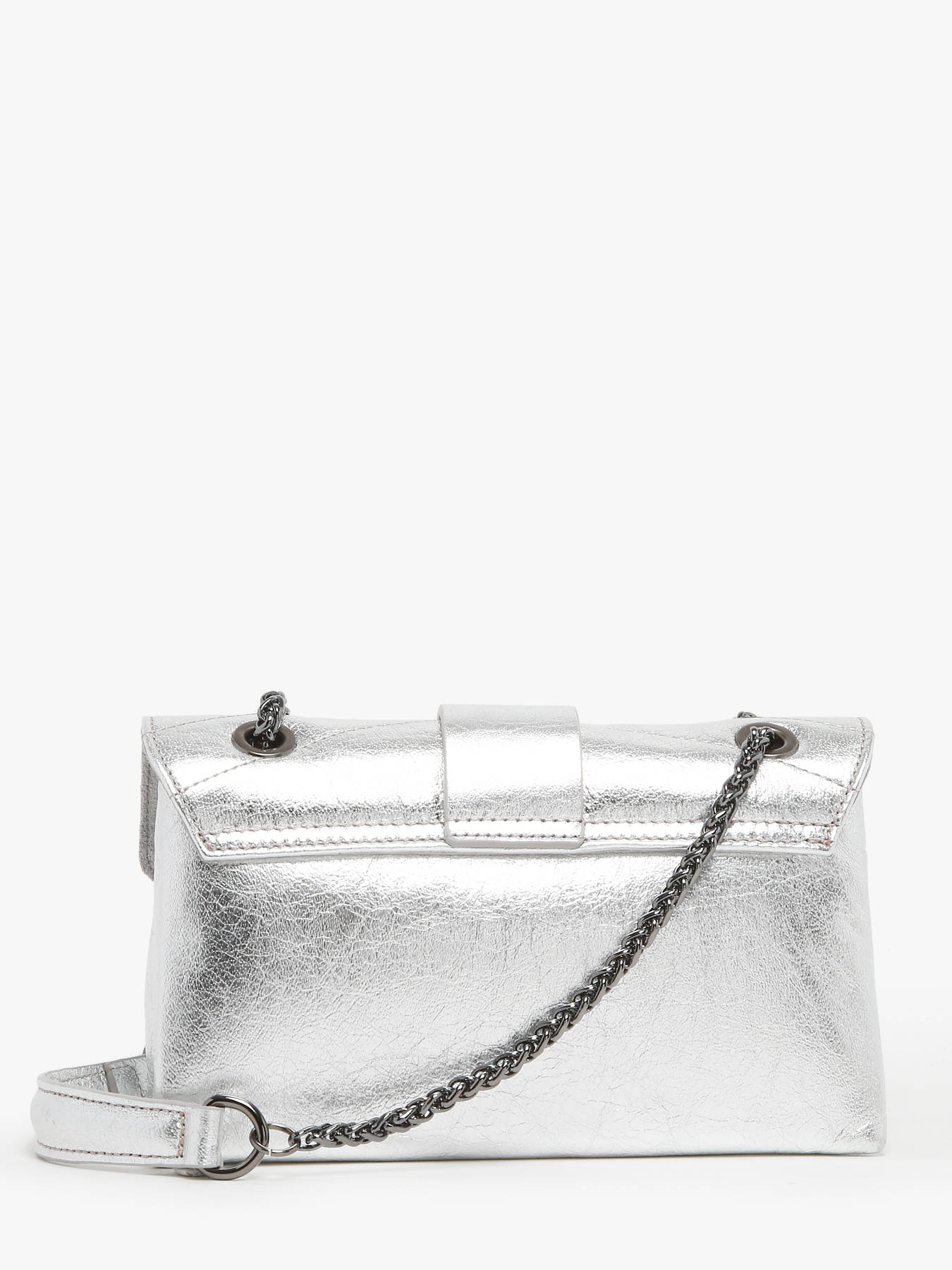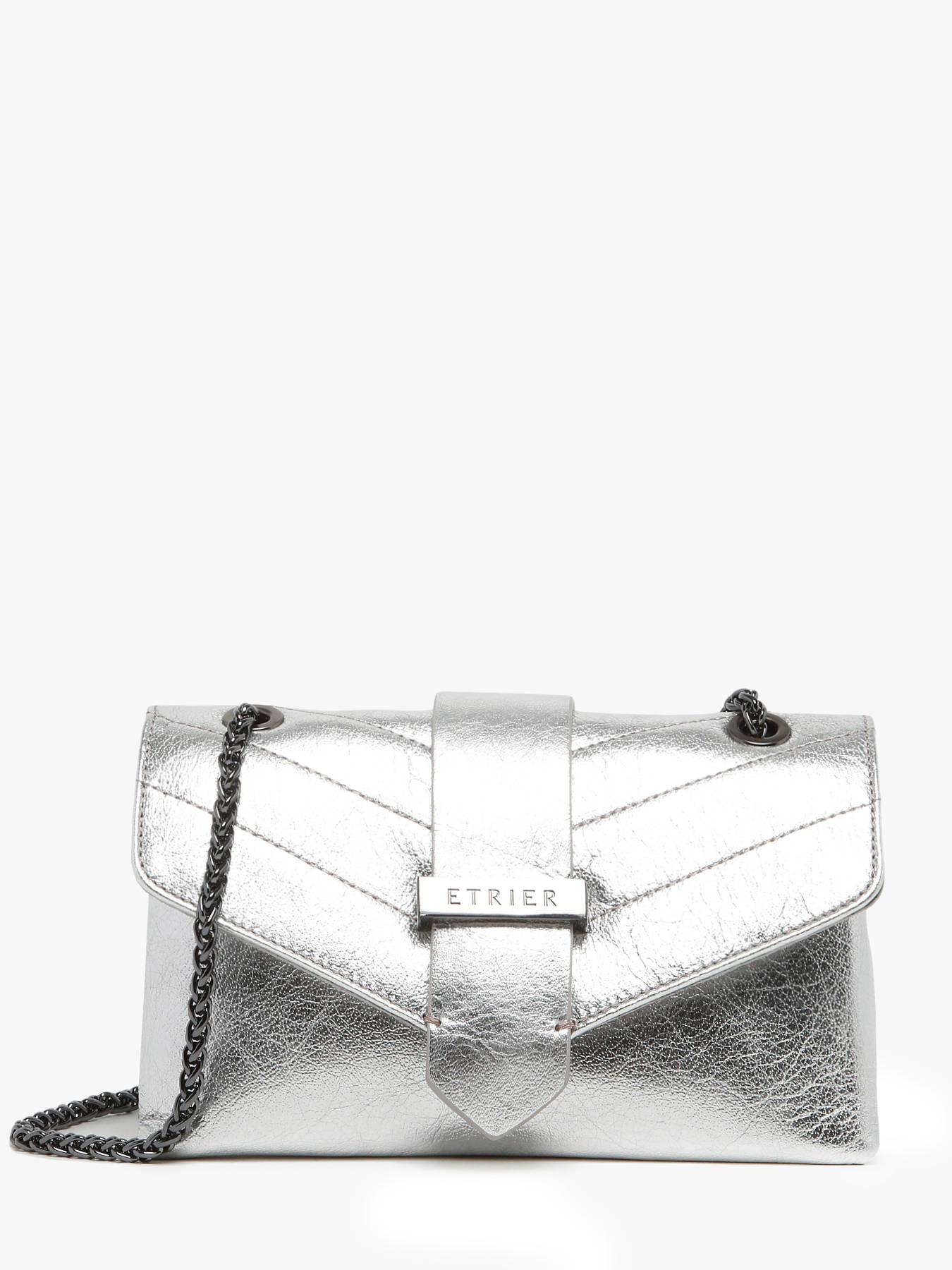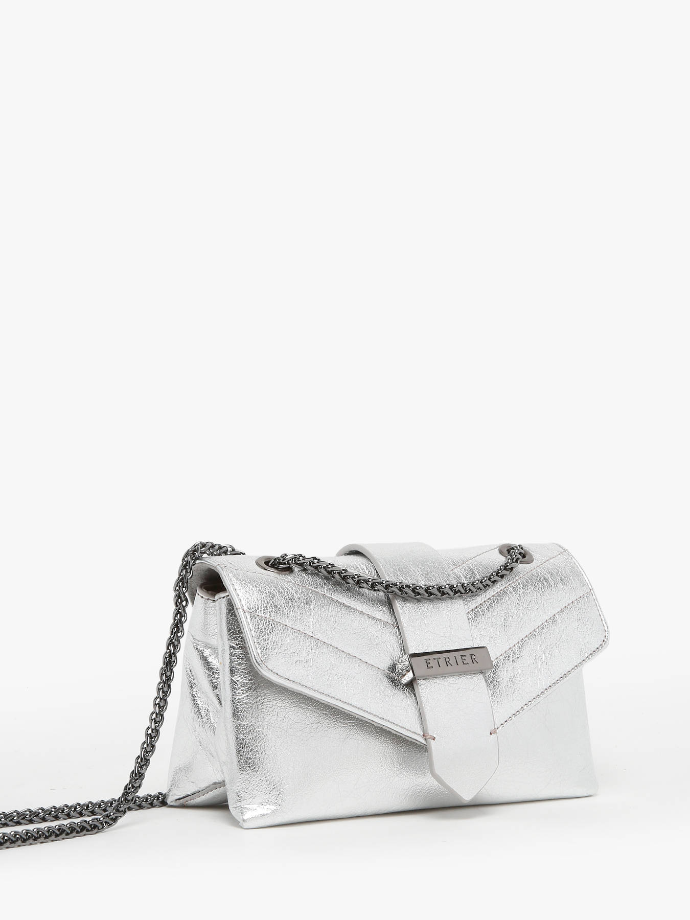 The ETRIER JANA IRISE crossbody bag is available in two sizes, presented here in its small format. Its slightly crackled leather with an iridescent effect adds an elegant touch. Featuring a baguette-inspired design, it is crafted from cowhide leather and closes with a magnetic flap. Equipped with a chain and leather shoulder strap, it can be worn crossbody or over the shoulder. Inside, two compartments house a slip pocket and a zip pocket, all lined with cotton for a refined finish.