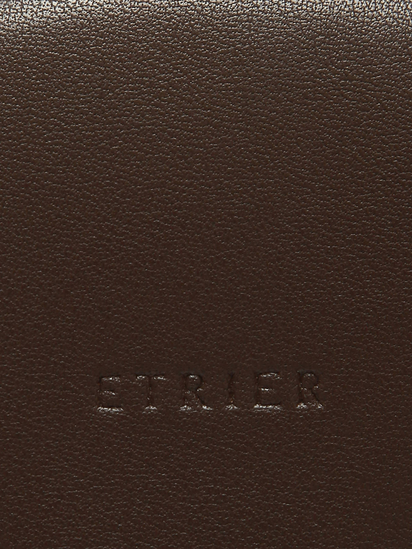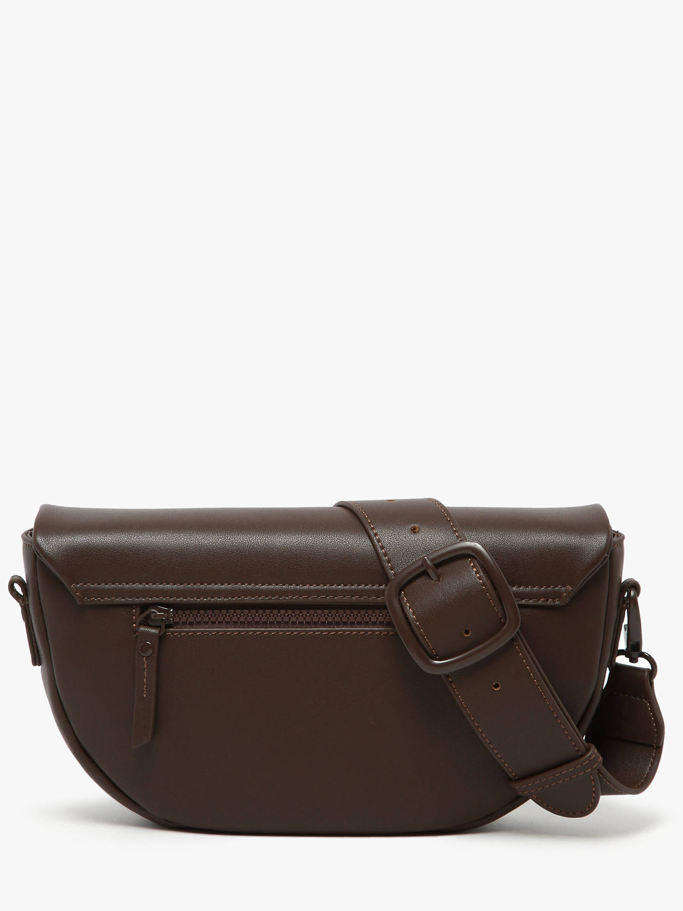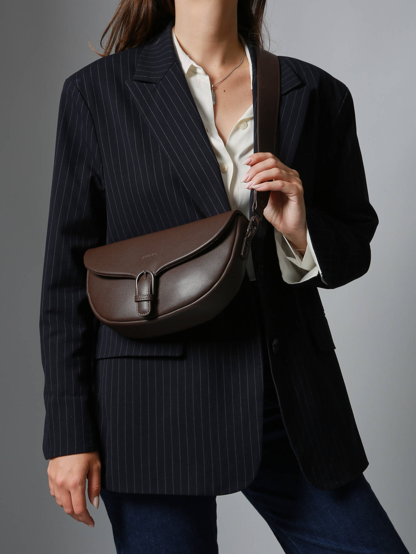 The new version of the ETRIER shoulder bag from the OXER line, in a half-moon shape, is adorned with tone-on-tone accessories. Crafted from cowhide leather, it features a back pocket and closes with a flap and magnetic snap. The adjustable and removable leather shoulder strap offers a short cross-body carrying option. The spacious interior includes a compartment with a patch pocket and a zip pocket for optimal organization.